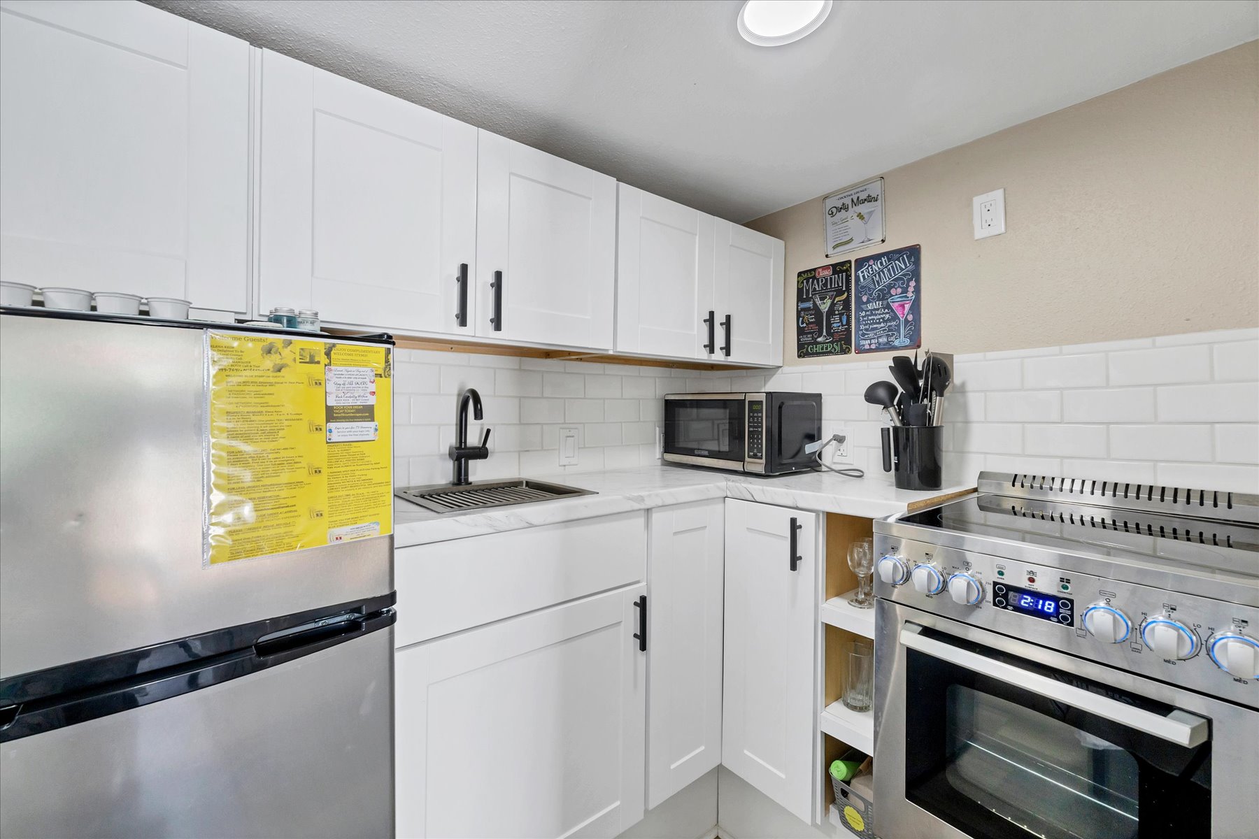 Modern kitchenette with compact range, fridge, microwave, toaster, cookware & both Keurig + traditional coffee makers